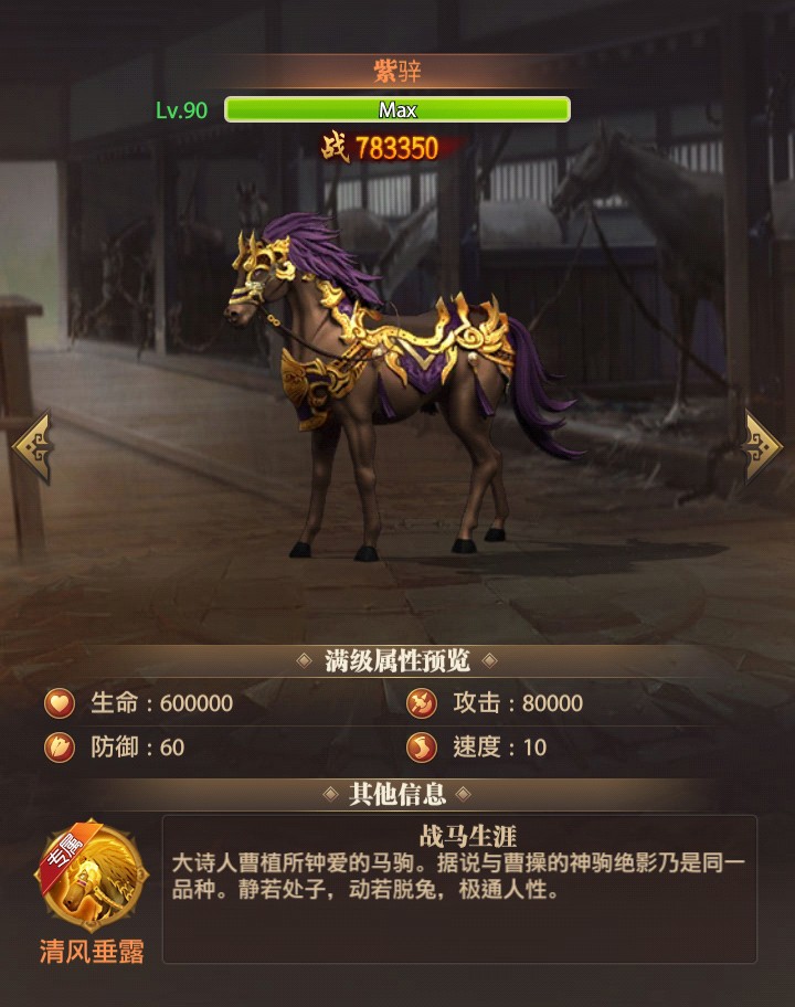 二、战马所带给武将的属性增益不受除战马百分比效果影响,所增加的属性为最终属性,