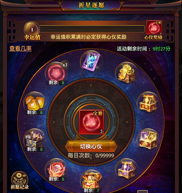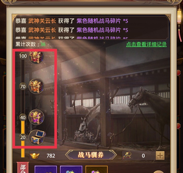 玩家可以通过奇珍阁御马苑抽取获得橙马和紫马碎片,累计达到一定次数获取的宝箱