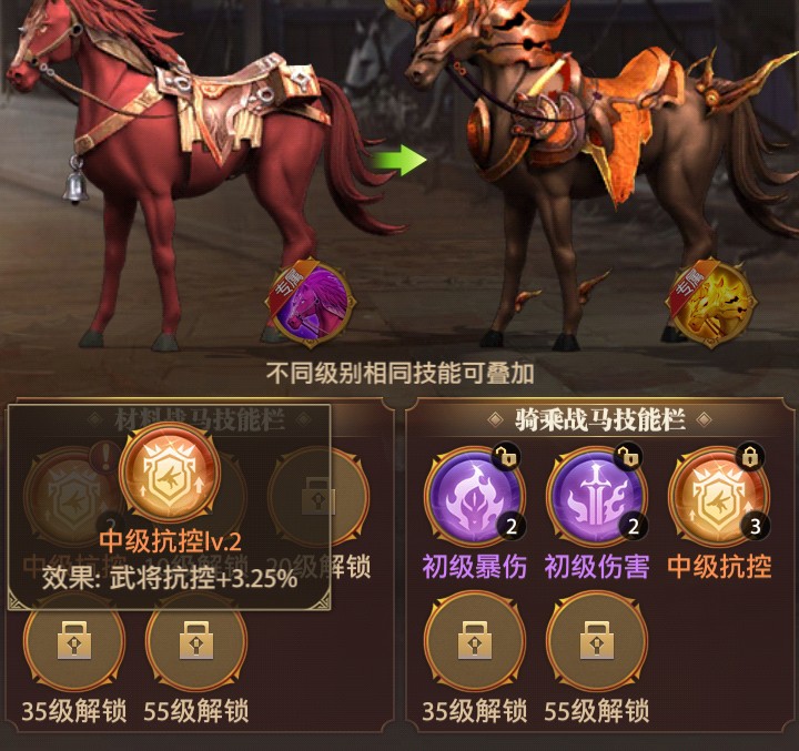 一、战马技能同类型同级别不可叠加,但是同类型不同级别可以互相叠加,