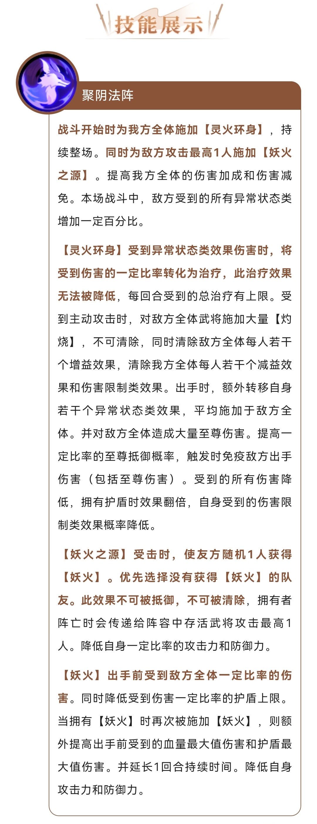 开局被动能够减少武将身上异常效果影响,能加灼烧,转移效果给敌方还能造成伤害,出手降低至尊伤害 敌方随机一个武将受到妖火,武将死亡还会传递妖火给攻击力最高武将。妖火能够降低护盾上限(尤其克制犬夜叉曹仁这种护盾有额外效果的)