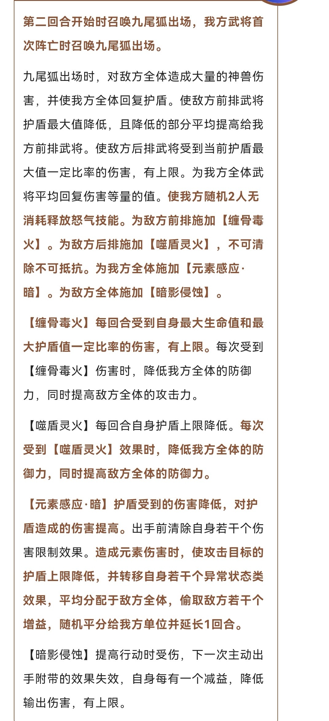 主动第二回合或者己方武将阵容触发,造成伤害加盾这不用说,降低对方最大护盾,让己方武将释放怒气技能,骨火给敌方造成生命和护盾相关比例伤害,灵火让敌方每回合降低护盾上限,元素暗能够降低护盾受到的伤害,加强对地方护盾造成的伤害,武将出手清楚伤害限制,若造成元素伤害降低目标护盾上限,转移异常效果,偷取对方增益,暗影侵蚀让敌方提高行动受伤,主动附带效果失效,每有一个减益降低伤害输出(降低有上限)
