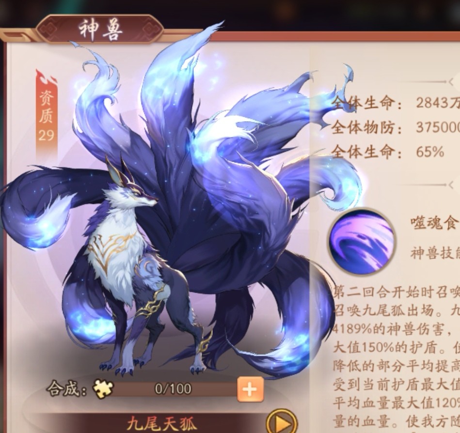 总评:赤金最后的神兽了,主打的是降低护盾,比前面的神兽更全面更偏向于控场的神兽,而且这个版本武将都出不了几次手,都是神兵战法神兽军师在打,神兽的重要性不亚于神兵军师的 。不过也到赤金版本末期了,新品质也在筹划了,大佬氪金新神兽也需要考虑再三,是否需要白嫖到新品质,最后放上九尾天狐的图,也是非常漂亮,比前一个鸟(说的就是你,孔雀) 好看而且霸气