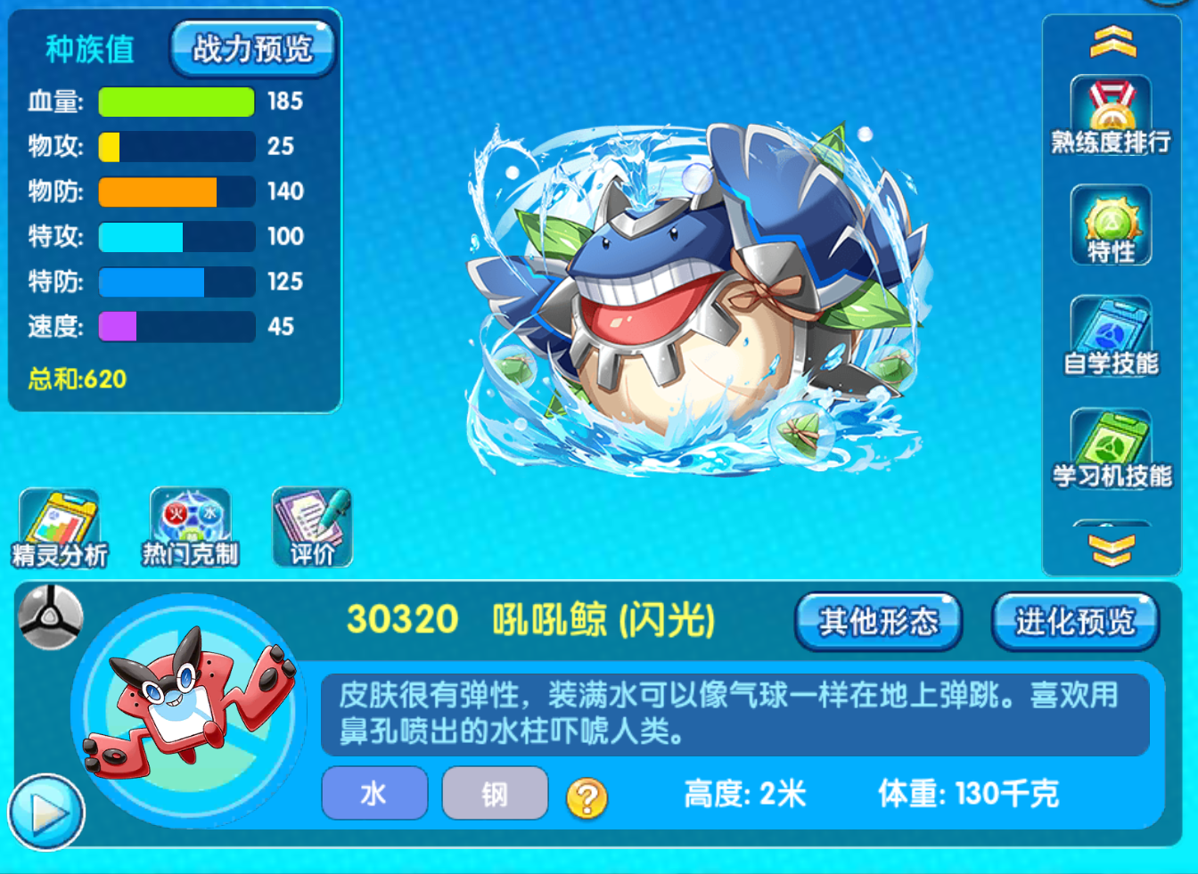 这个精灵整体来说就是一个吼鲸王的升级版本,技能特性都是一模一样的,没有任何的区别,唯一的区别就是种族值和样子不同,但是这两个精灵的环境是一模一样的,如果多花一点点钱买它,我感觉太亏了,因为环境属实太差了,买来就会被疯狂的吊打,更何况当前版本小智路卡利欧、闪电鸟、巨沼怪满天飞的情况下,这个精灵根本打不出任何的优势。
