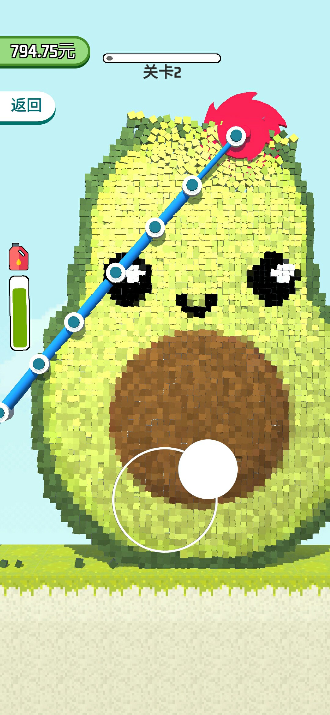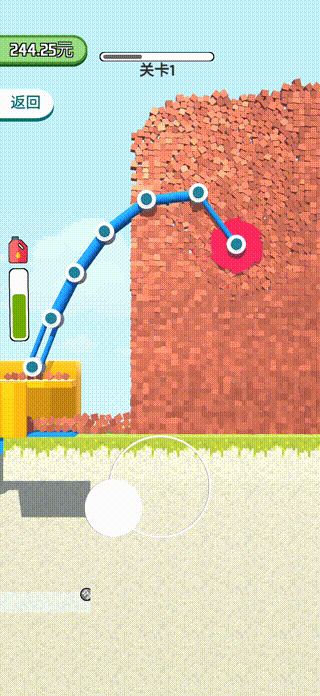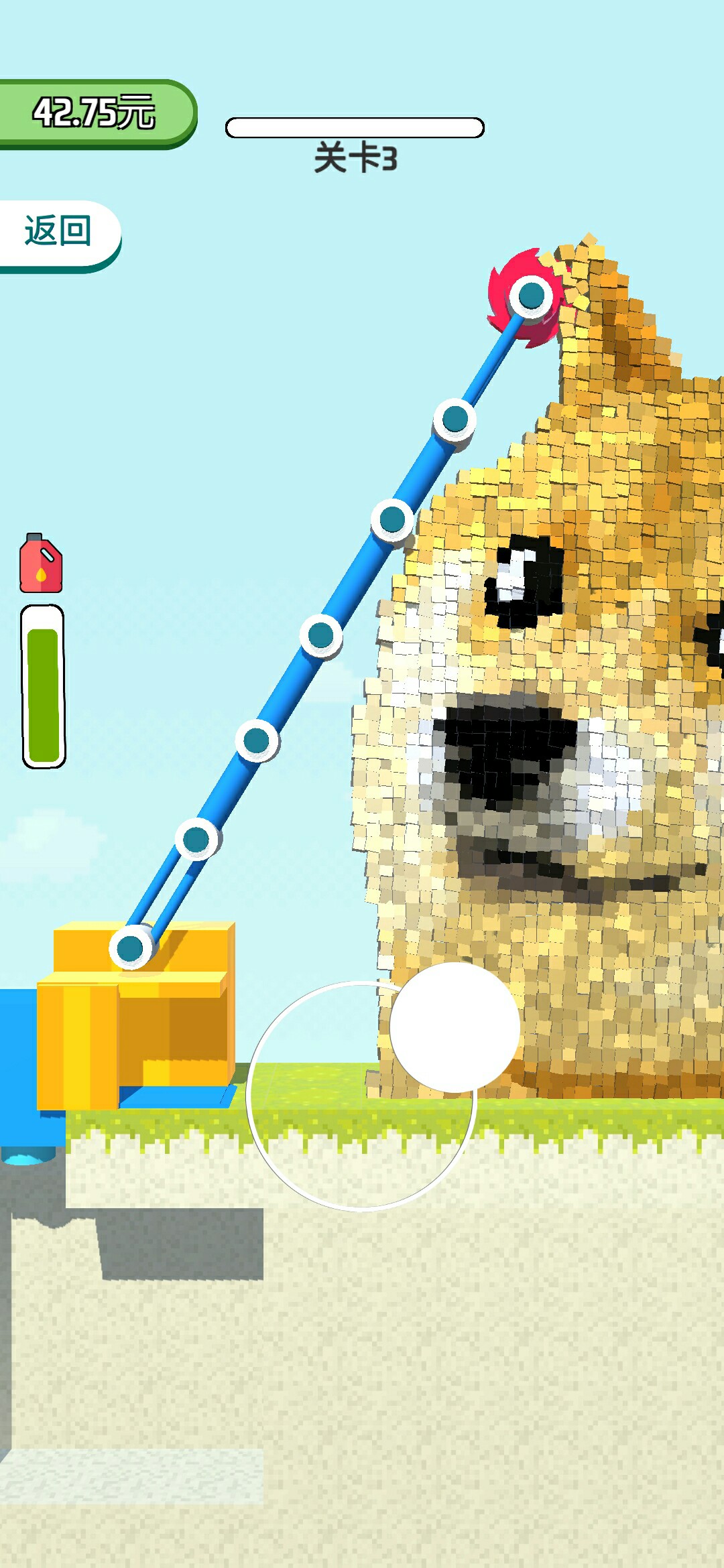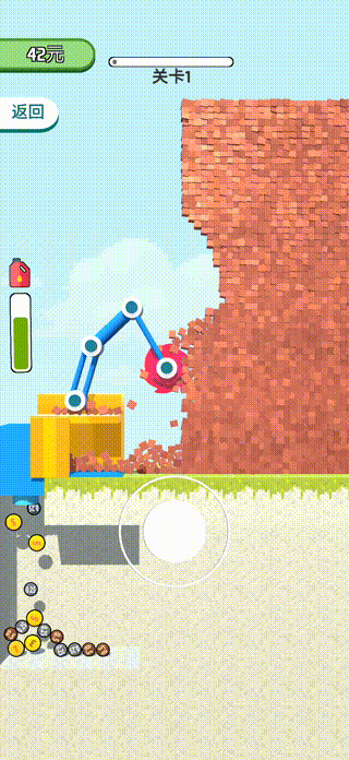 这款游戏很有意思,拆墙不再用“大锤”,而是控制一台“长臂锯齿机”来完成,长臂锯齿机的锯齿在墙上切割后会将墙体切割下微小的“砖块”,这些砖块通过掉落至回收站就会自动获得金币。