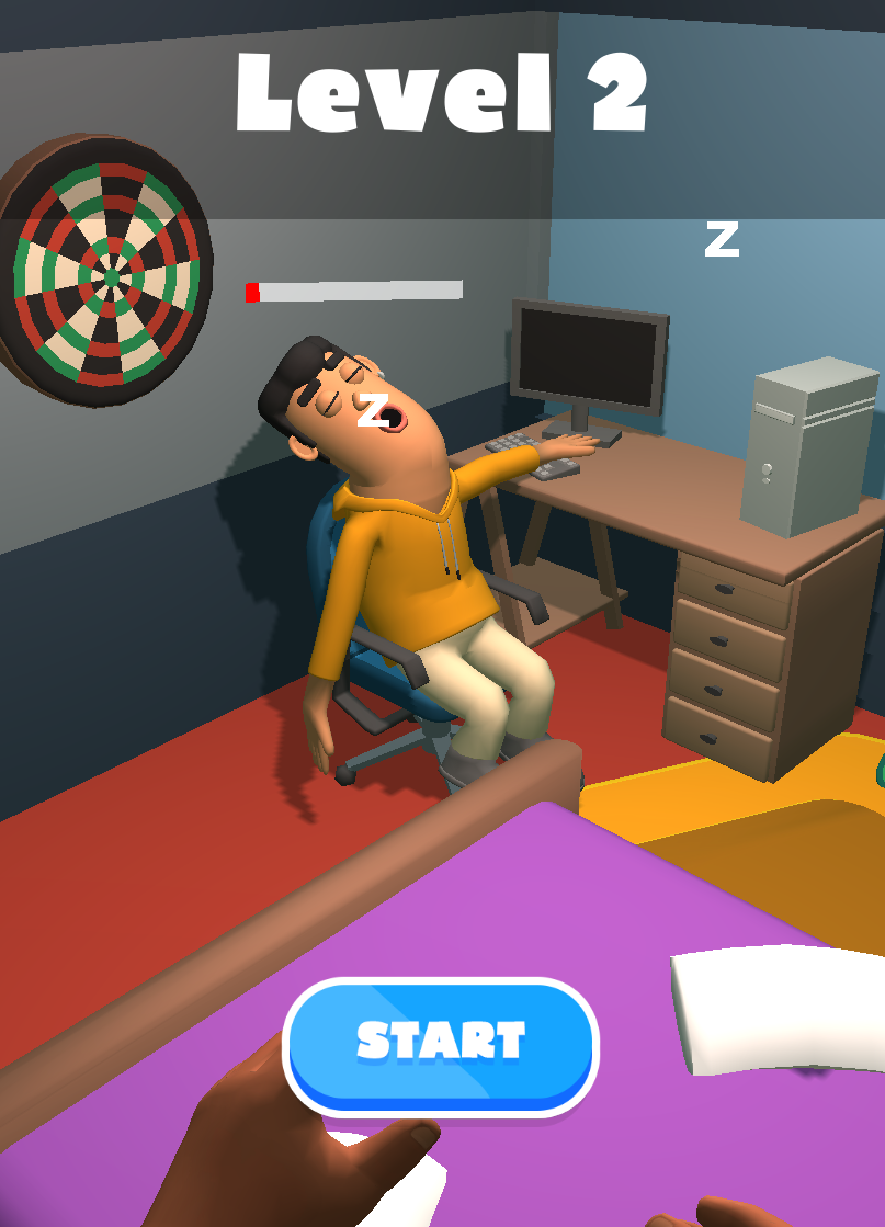 把睡着的人给叫醒就需要拿起房间中的东西砸向他,枕头、纸巾什么的都可以,叫醒他之后你会看到房间里已经被咱们折腾的一团乱了。