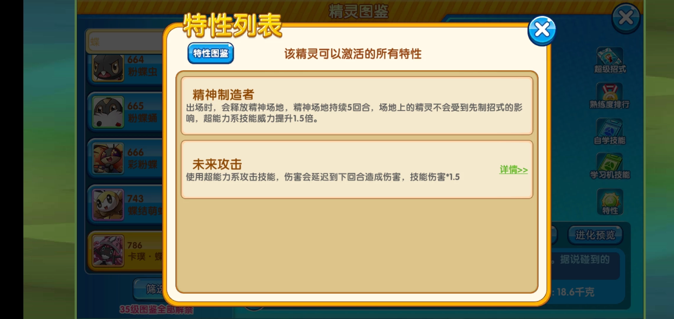 精神制造者:出场时,会释放精神场地,精神场地持续5回合,场地上的精灵不会受到先制招式的影响,超能力系技能威力提升1.5倍。