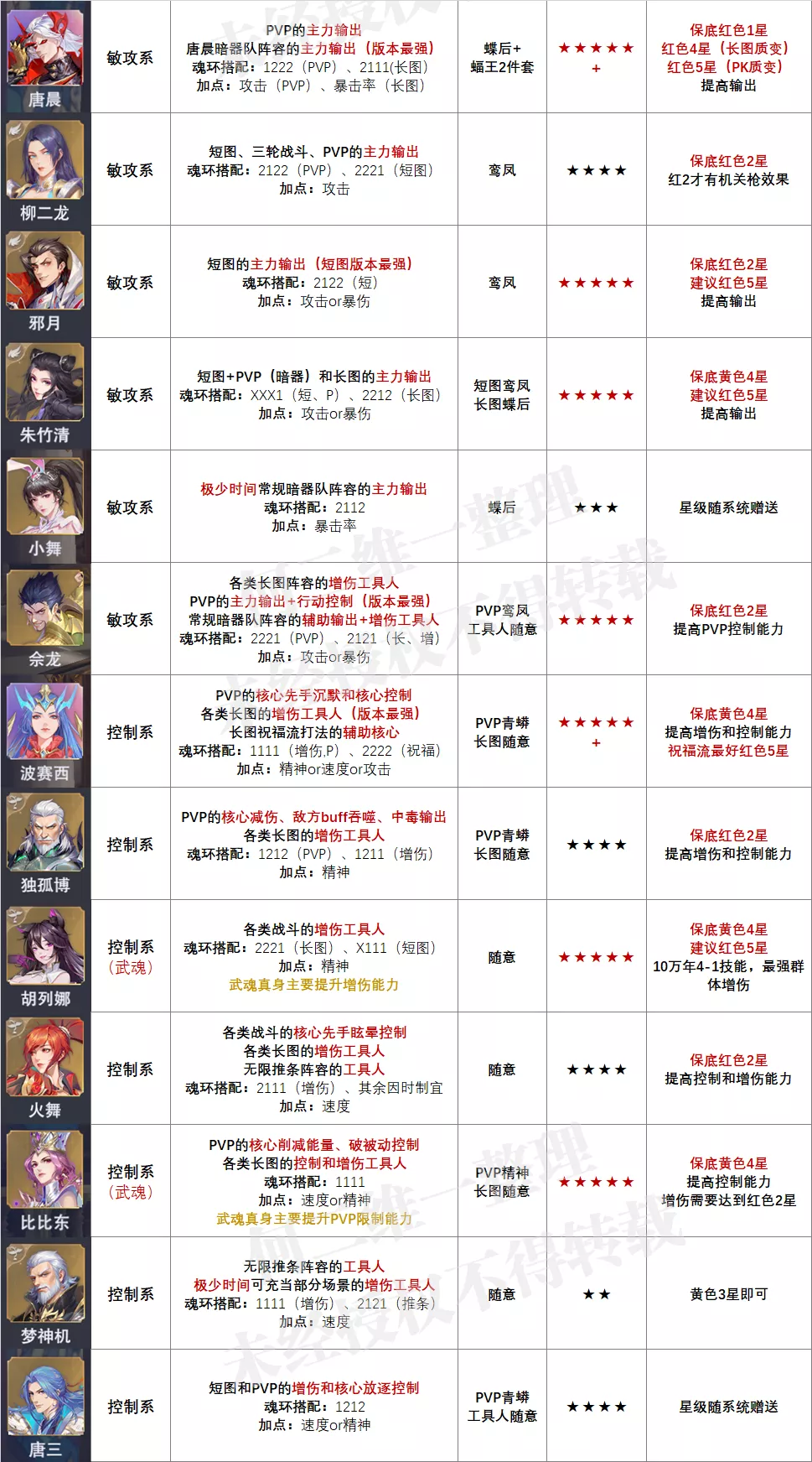 在推荐的魂骨上,目前来看呈现出的趋势大致是强攻系短图以爆裂为主,然后PVP需要择机选择,长图以狂猿为主;敏攻系短图以鸾凤为主,PVP需要择机选择,长图以蝶后为主;控制系的魂骨则相对没有那么固定,更多则可以考虑青蟒,最后辅助系肯定是以智慧为主,但要注意部分场景并不需要触发24星的再行动效果,例如祝福流中的唐月华就不需要这个效果,大家应该根据不同的战斗场景进行调整,另外防御系则以蓝银皇为主即可