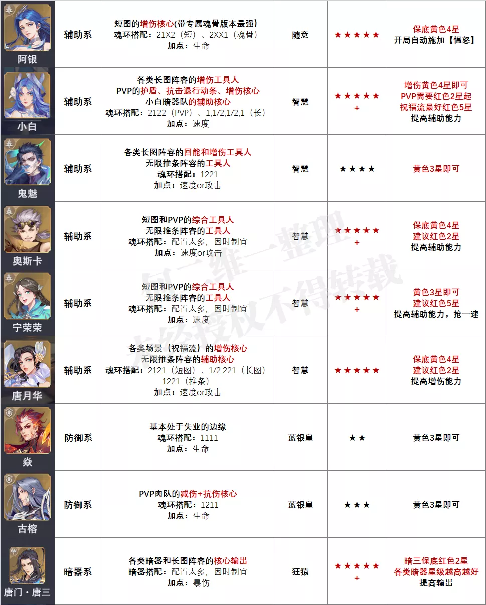 针对不同魂师的培养优先级,其大致的分级标准如下: