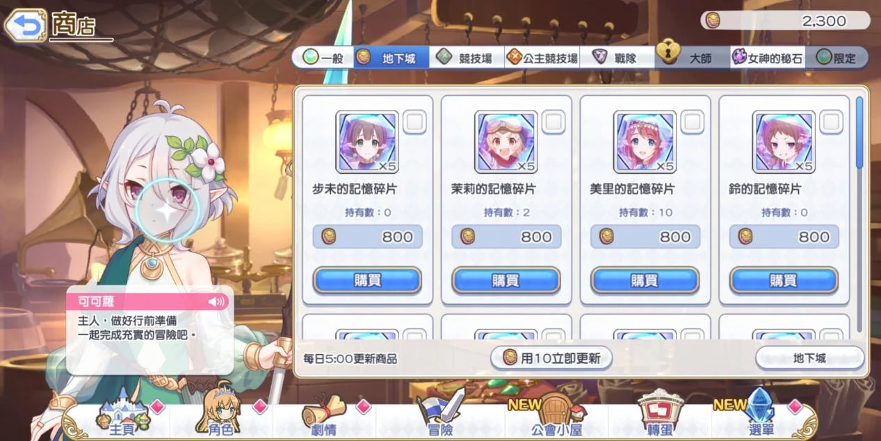 类似于爬塔,一层一层往上打。副本难度能打多难打多难,即使打不过boss,也会比之前难度的收获多。这个玩法主要看你前排和奶量了,基本要保持过了前面的关卡之后,到boss面前是满tp满hp的,打boss用有破甲或单体伤害较高的人物加一个坦克和一个回tp的辅助就差不多了,可以拿别人的一名援助人物(消耗一定玛娜)来通关,第一次通关后获得家具,可在工会小屋摆放。地下城币也可以兑换一些人物的碎片,是一些人物碎片的重要来源。