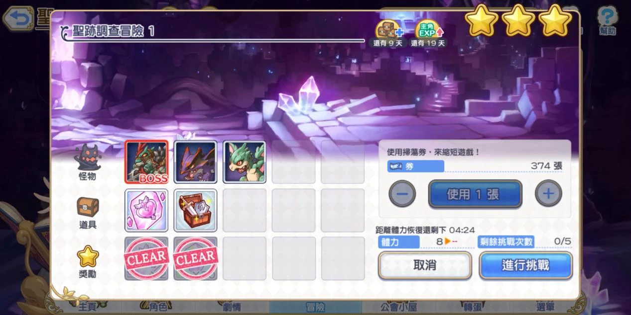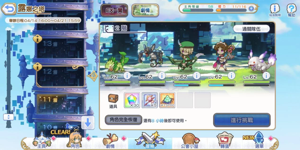 与地下城玩法相类似,是特定时间开启的限定活动,通常持续一周,通关normal9-1后可以参与。副本需求队伍量较高,24小时可使用全角色回复的效果把所有人物的hp回满,接着继续打,打倒特定层数可开启ex冒险,打到boss可以获得公主之心,是装备和公主之心产出的重要来源。值得一提的是,不要全肉来慢慢打,一旦超过时间则会算你的队伍全灭,所以编队一定要保证输出。