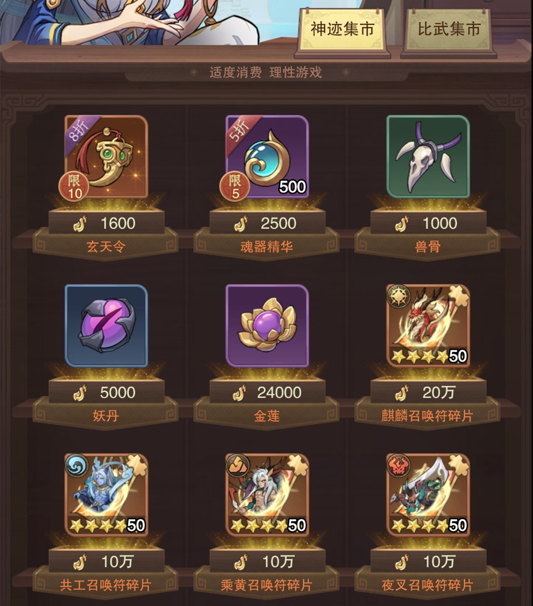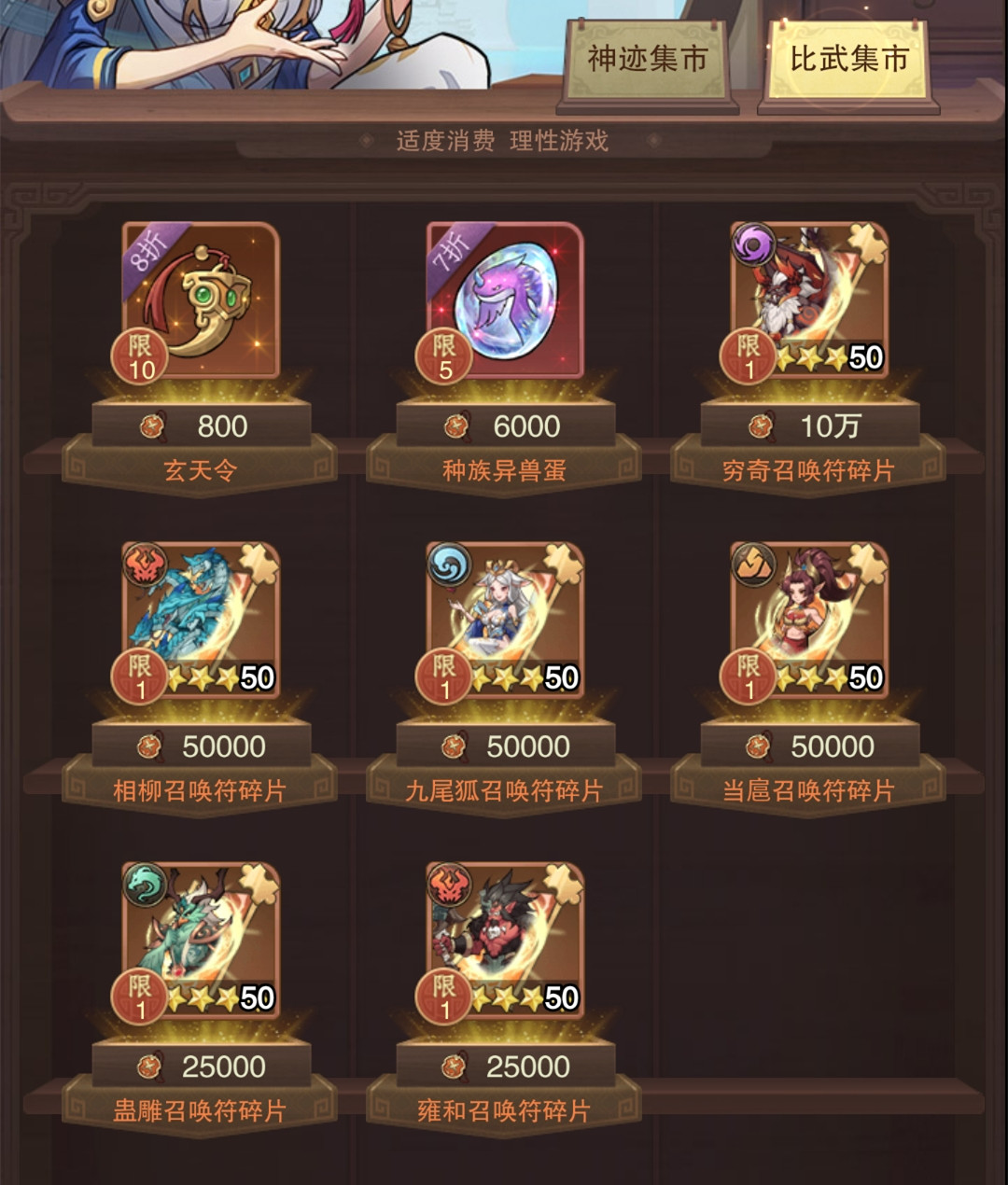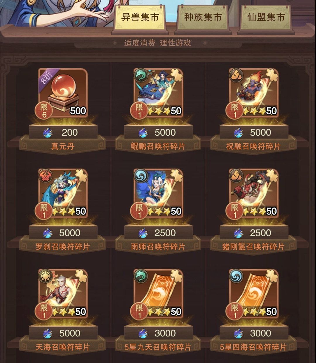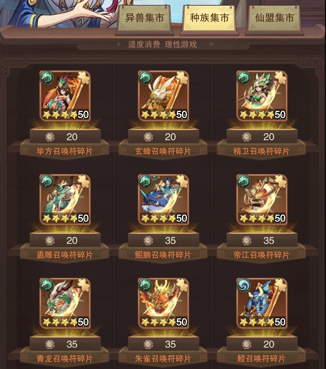 五.种族集市不刷新,在自己阵容未成型前,种族币可以先攒着,等确定队伍方向。在选择核心人物购买,个人推荐购买异兽:麒麟、白泽、混沌、穷奇等神道灾厄强势异兽,当然也可自己的阵容来选择搭配。