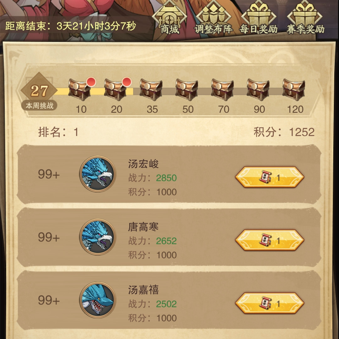 1、每次可以看到3个可挑战的对象,每个挑战的对象都会看到他的积分和战力,因此大家可根据自身战力去选择挑战对象