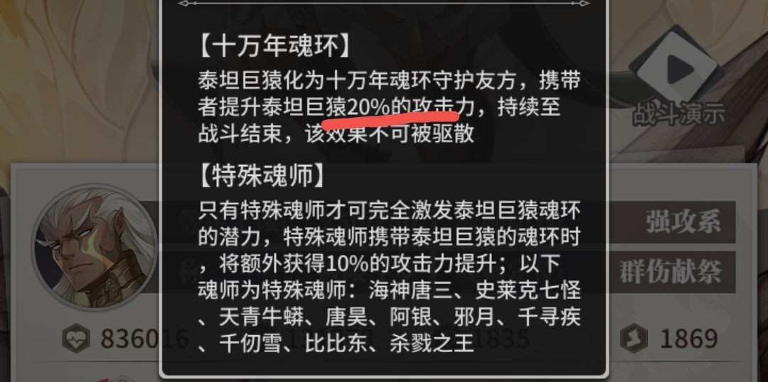 另外,泰坦巨猿即使阵亡,也会变成魂环附加给我方攻击力最高的魂师,使土系的输出和生存上限更高(如增强戴沐白的爆发能力或蛇龙的续航能力,魂环提升20%的攻击,附加泰坦巨猿生命值25%的免伤)