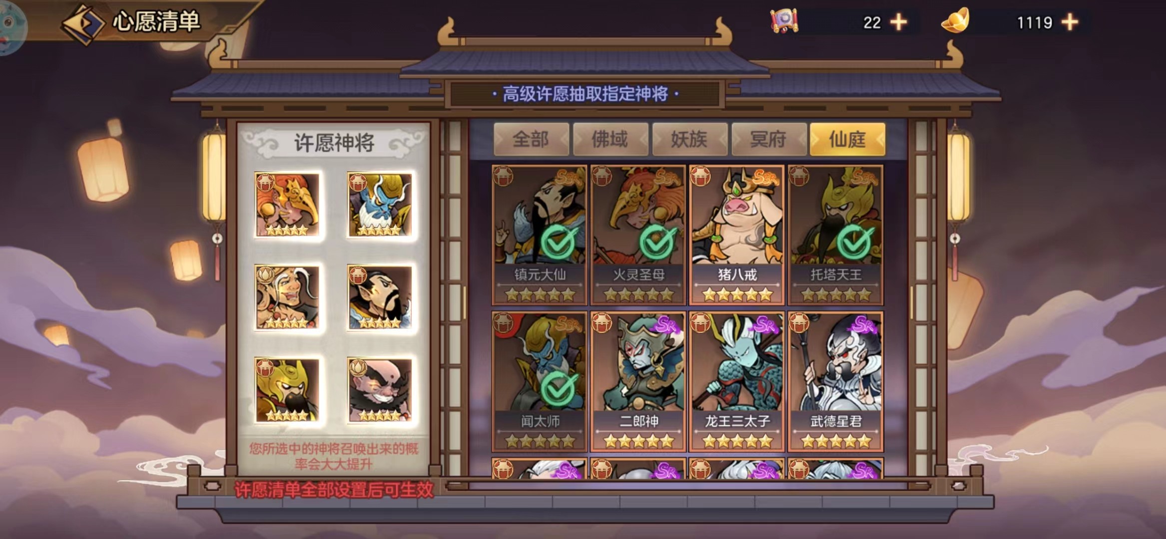 ★弄明白了主c。那么开局就要把心愿单设置好,镇元大仙,托塔天王,闻太师,火灵圣母,猪八戒,济公,欢喜。(为什么玩天庭要设置济公。欢喜,)因为可以考虑混搭,看已经是纯天庭还是混搭天庭。
