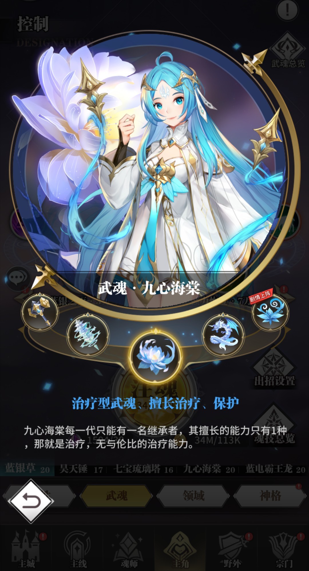 ③ 九心海棠:这个魂技比较特殊,身为唯一的奶妈魂技,作用就比较小,带来的收益也是为(复活)(持续回复)(百分比回复)这个魂技看上去比较适合土队或者搭配三辅一前排的魂师队伍,或者副本爬塔,复活自家魂师。