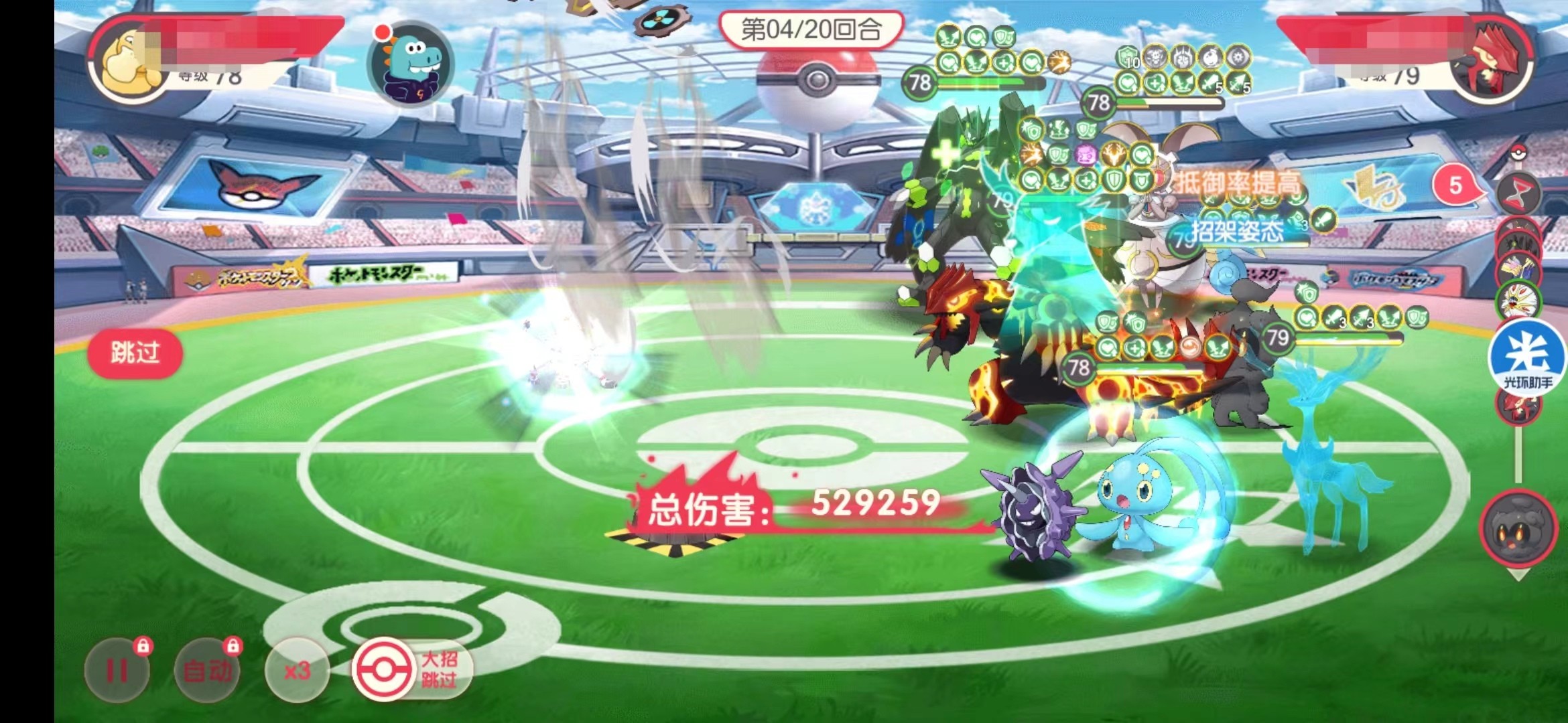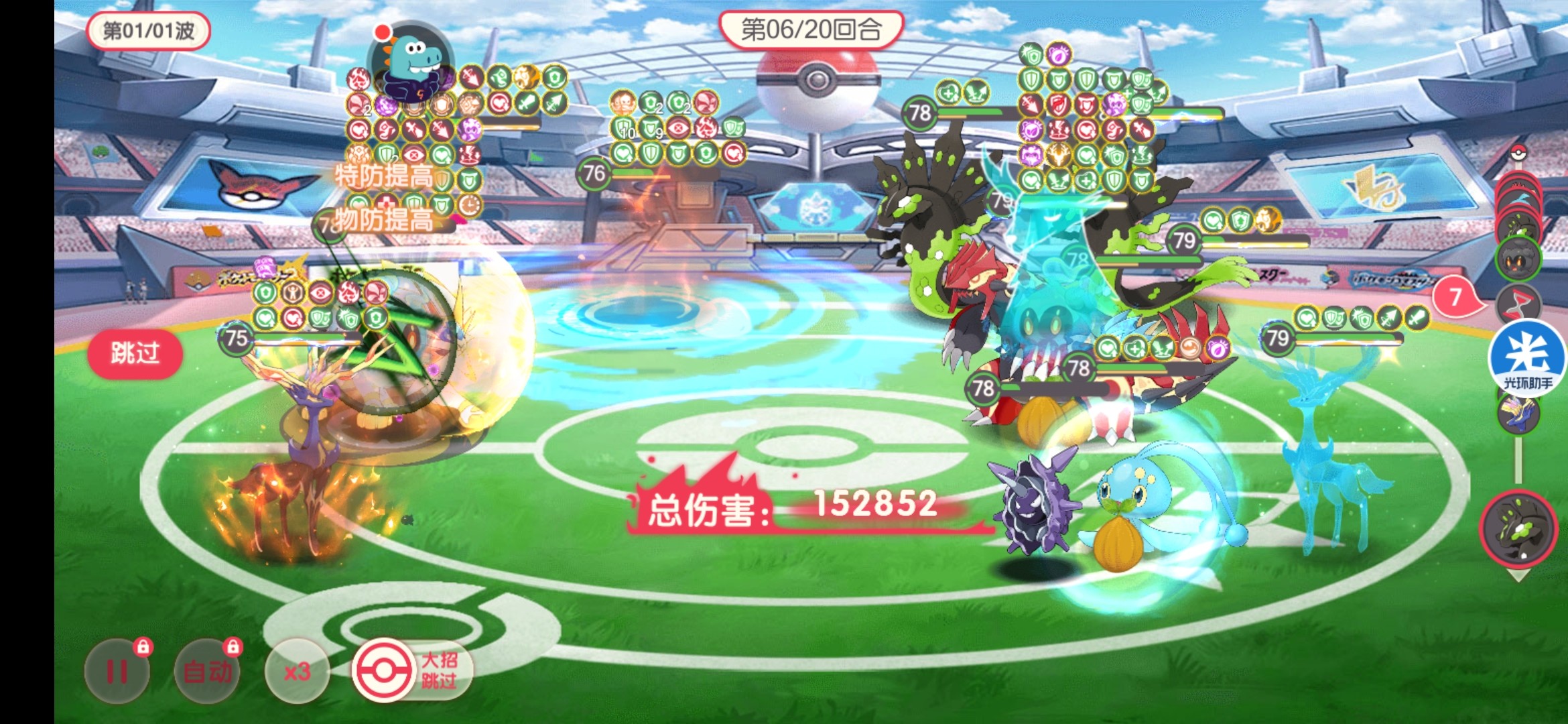 下图是换上X鹿和时拉比的对决,第6回合依然可以打;这和猫玛组合一样道理,站着才能输出,8星玛夏多绝对不如带8星猫的4星玛夏多好用!
