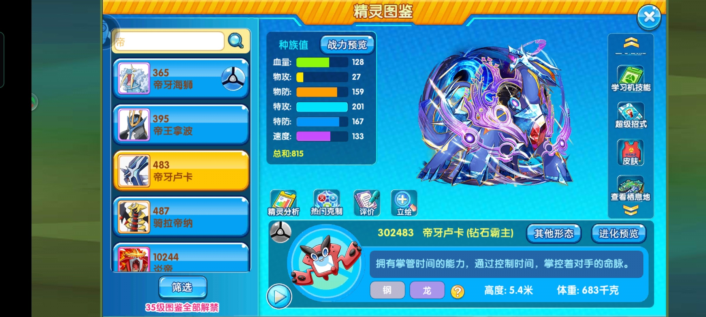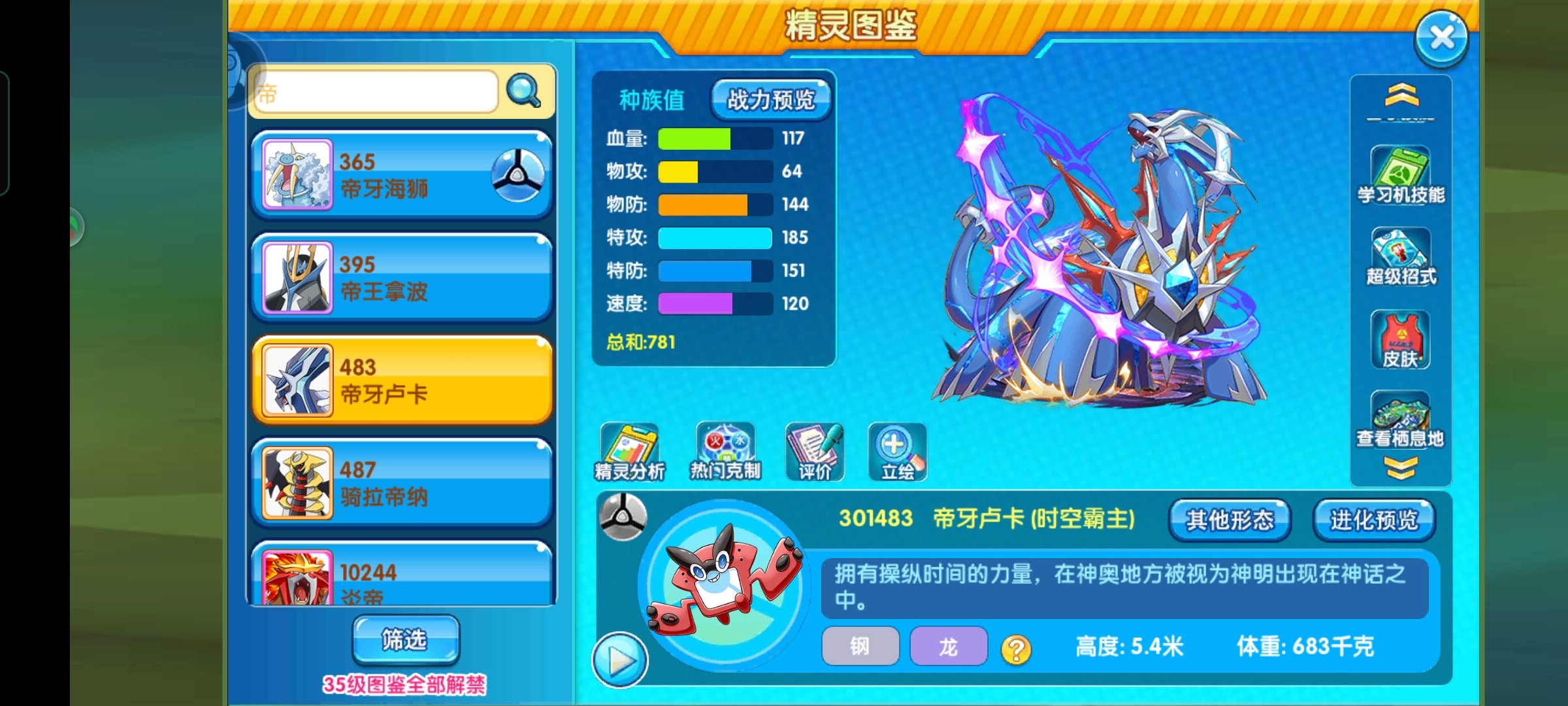 总结:原版中帝牙卢卡像是周身带有金属部分,身上有数道浅蓝色条纹的深蓝色蜥脚下目恐龙。它的头上有方锥形突起的顶部,淡蓝色的条纹从锥尖延伸到帝牙卢卡的脖颈。而它还有起源形态,可惜这次没有表现出来。按照复刻尿性可能后面还会出新的氪金,不过目前这个形态强度也足够,应该可以用很长的版本,本期攻略就到这里,如果大家有什么不懂的问题,请@我,我都会认真回复,我是@白璇,我们下期再见,记得点赞哦!