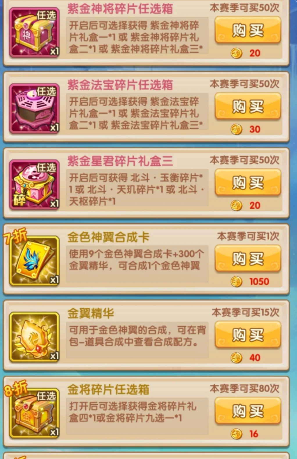 在紫金全部兑换完毕够,金色物品的兑换开始咯金色物品的优先级是:金色神翼精华>金色神翼合成卡>金色法宝碎片任选箱子>金色武将碎片任选箱>金色法术碎片任选箱子