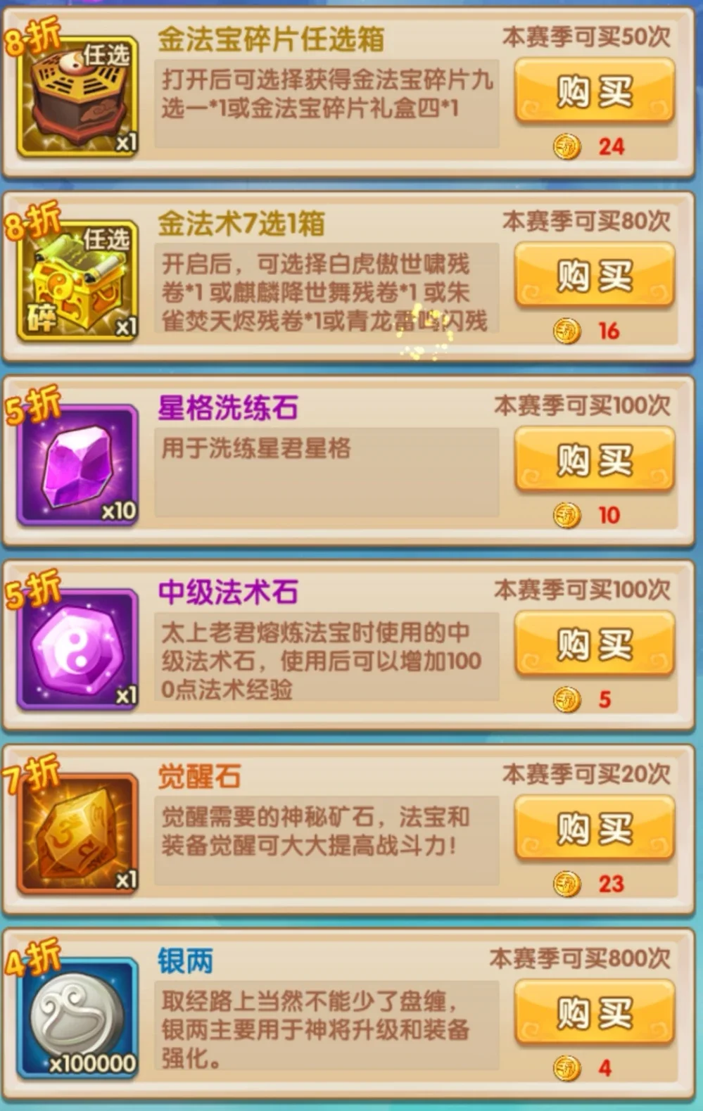 紫金和金色的都兑换完毕了,接下来就是兑换其他道具的时间了其余道具的优先级是:星格洗练石>觉醒石>银币>法术石