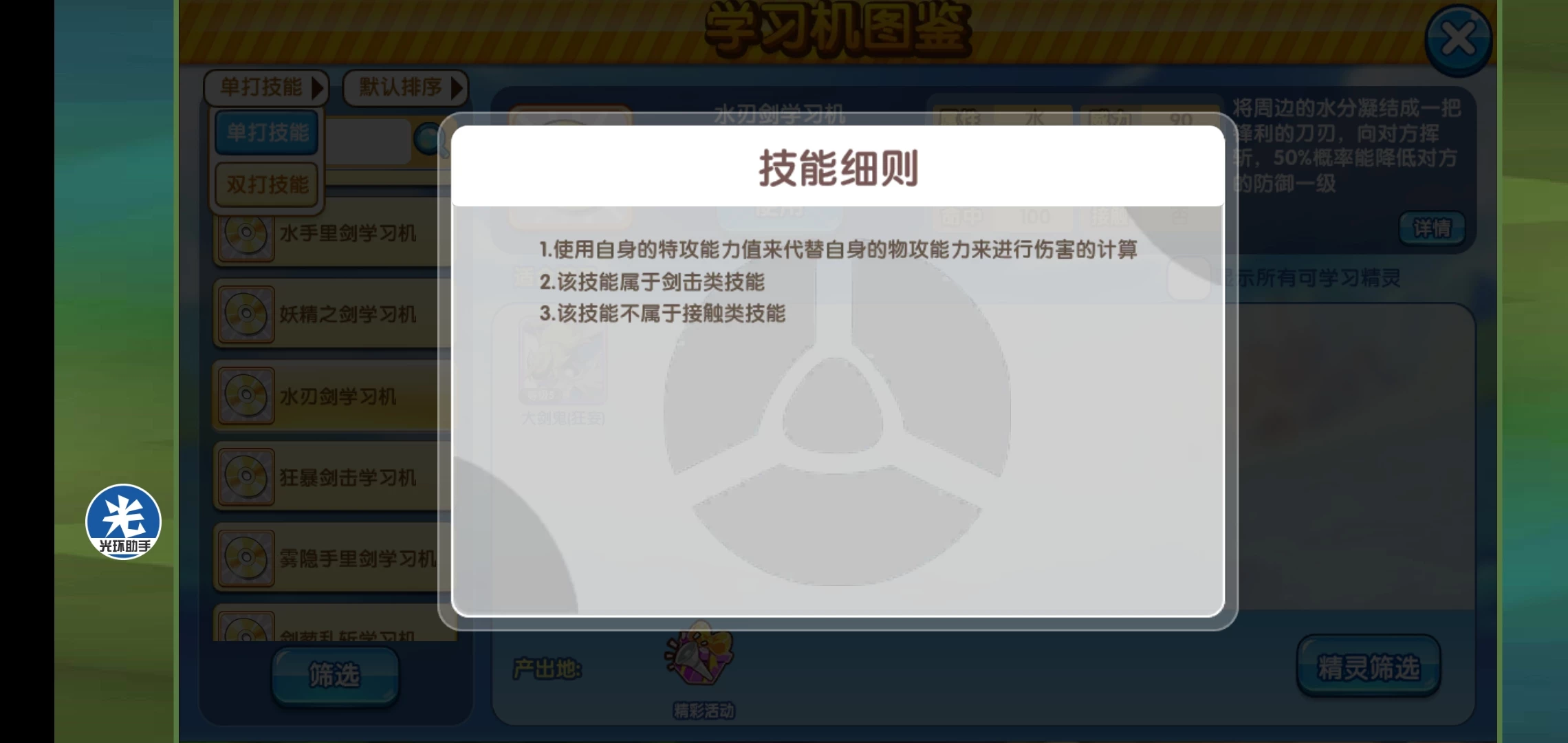 包括这个水刃剑,显示的是水系物攻招,我还见过萌新不懂的,把小马哥搞成开朗带它……而且这个技能还不解释清楚,你得点开特性细则才能知道,它是以特攻计算物攻……