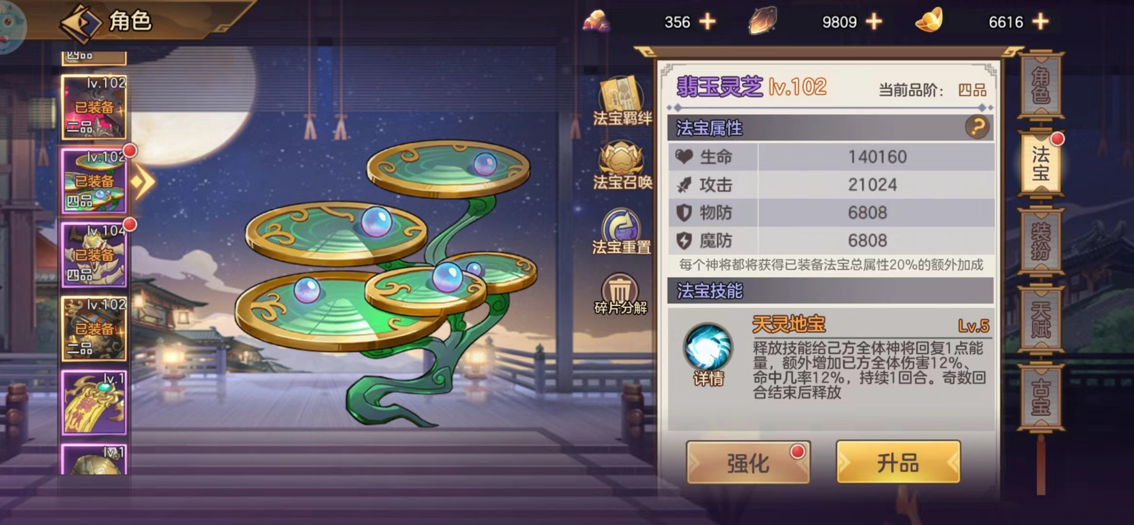 ★灵芝或者紫金钟:给全体回能还加伤害。当然灵芝在推图可以换紫金钟。灵芝偏pvp。如果不喜欢灵芝可以换紫金钟,加大伤害。