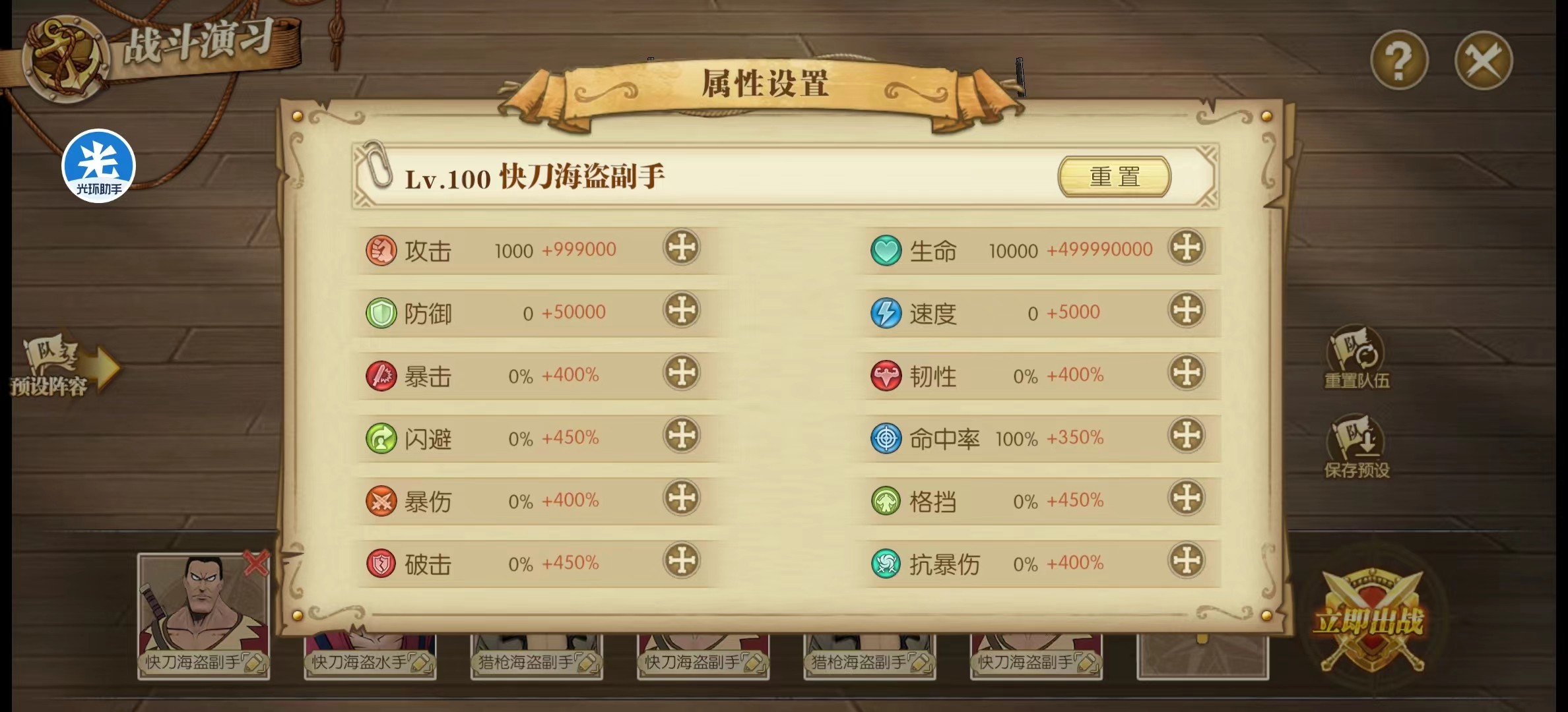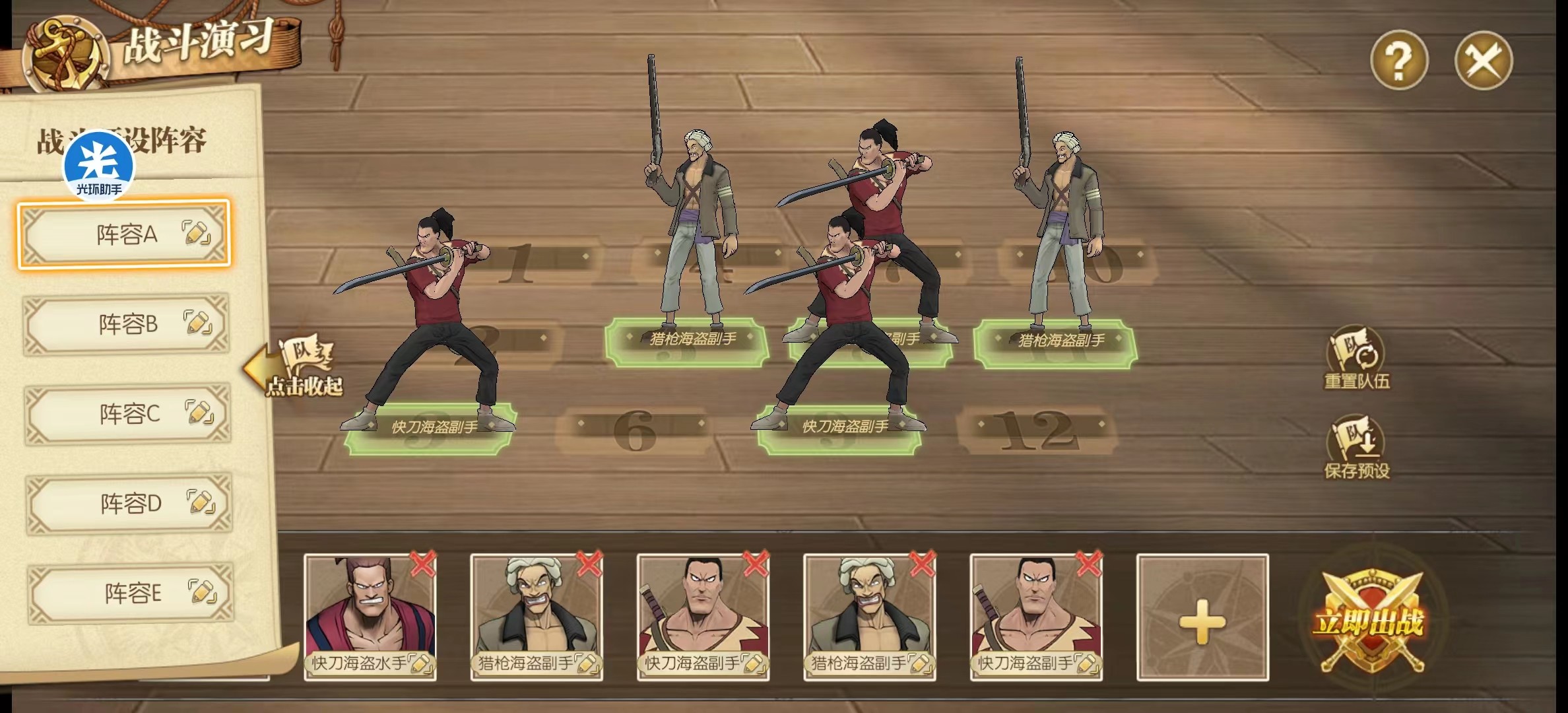 首先训练场可以自己挑选对手(下面这几个海盗)位置和阵容都自己搭配,同时可以自己保存多套整容方便测试,不得不说非常人性化,点赞。