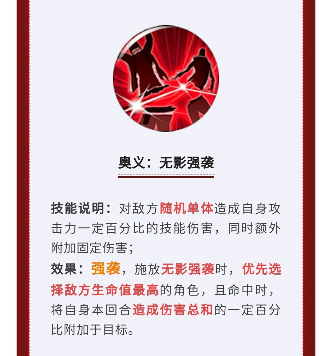 技能说明:对敌方随机单体造成自身攻击力一定百分比的技能伤害,同时额外附加固定伤害;