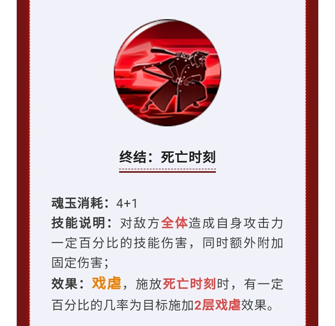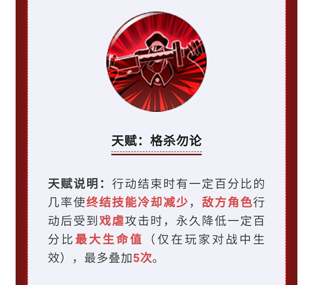 天赋:格杀勿论天赋说明:行动结束时有一定百分比的几率使终结技能冷却减少,敌方角色行动后受到戏虐攻击时,永久降低一定百分比最大生命值(仅在玩家对战中生效),最多叠加5次。