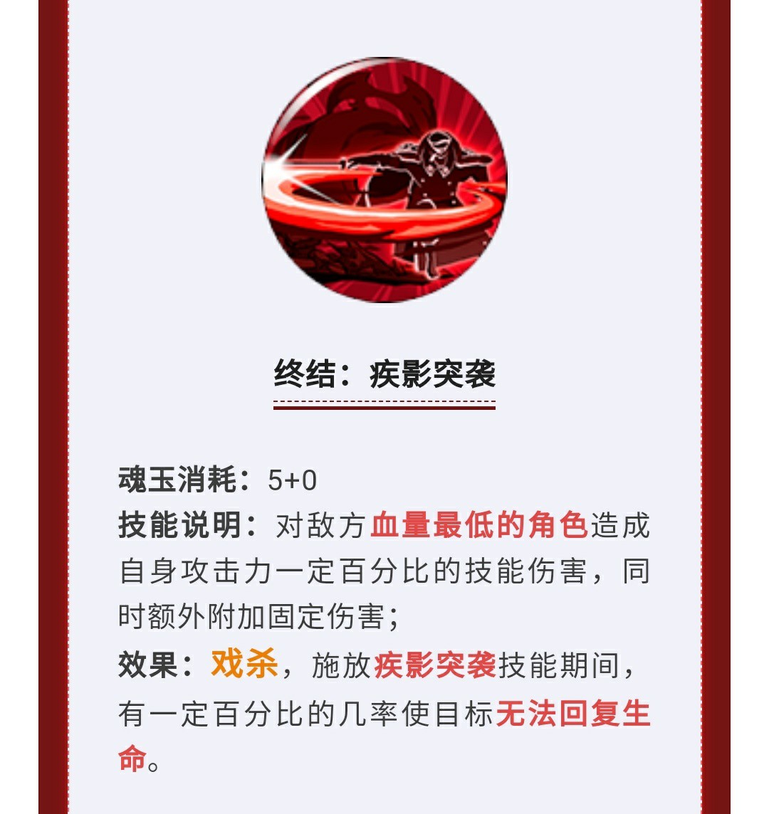 技能说明:5魂单体血量最低锁定技能,同时能让目标无法回血(克制复活)