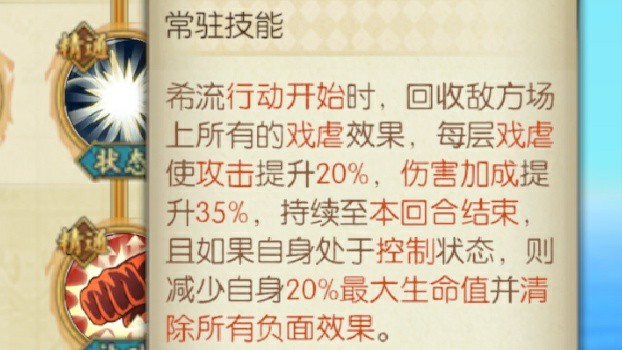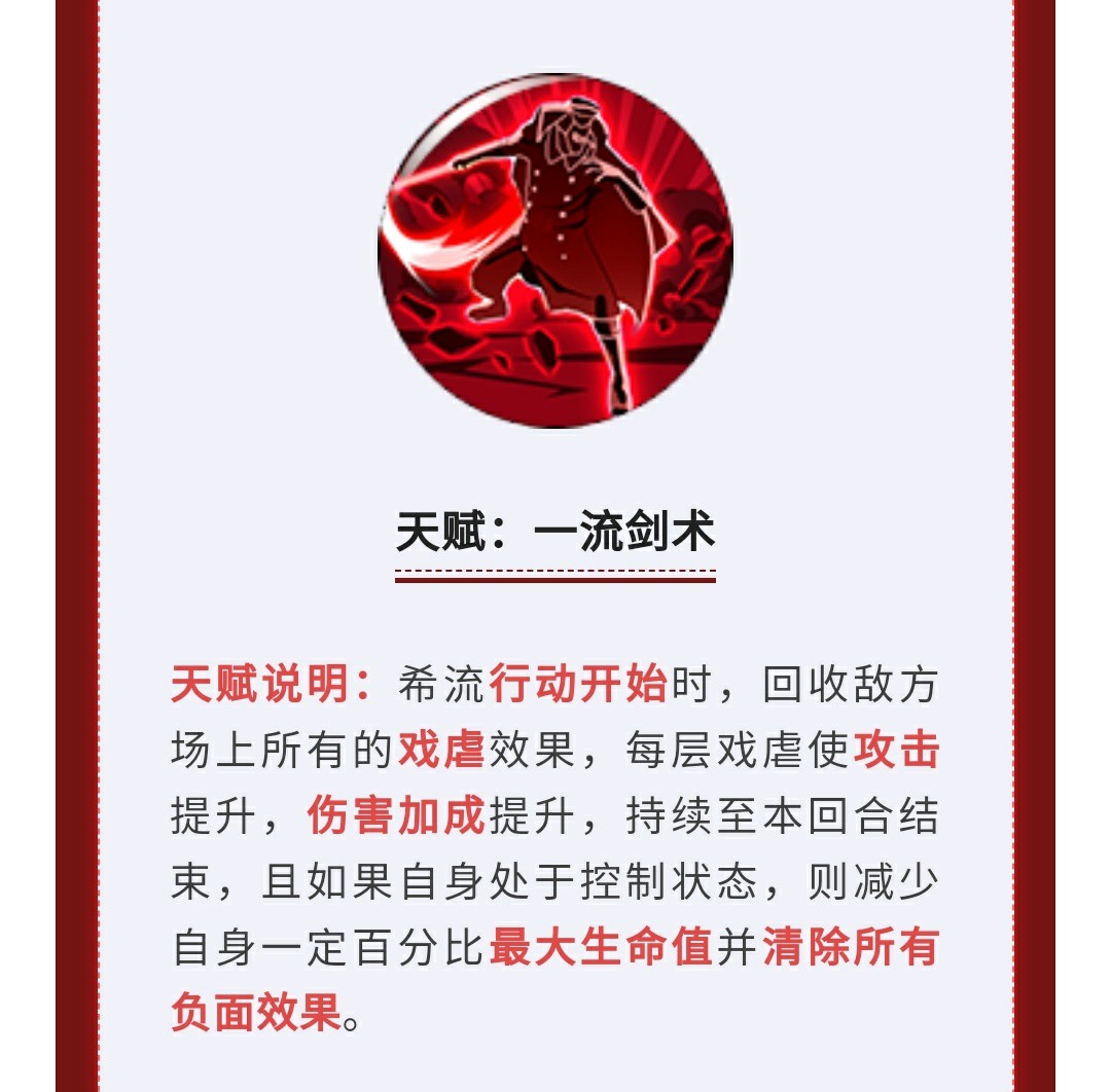 天赋:一流剑术天赋说明:希流行动开始时,回收敌方场上所有的戏虐效果,每层戏虐使攻击提升,伤害加成提升,持续至本回合结束,且如果自身处于控制状态,则减少自身一定百分比最大生命值并清除所有负面效果。