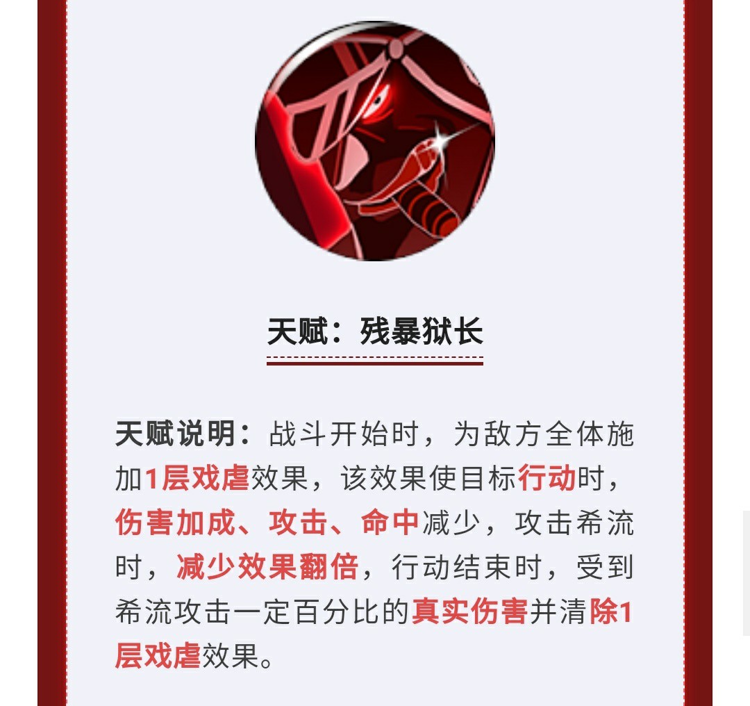 天赋说明:战斗开始敌方全体施加1层戏虐效果,这个只有在目标行动时,伤害加成、攻击、命中减少(看好是目标行动的时候,行动前行动后是没影响的),如果目标攻击的是希流时,减少效果翻倍,行动结束时,受到希流攻击一定百分比的真实伤害并清除1层戏虐效果。