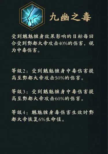 地府的九幽之地存在着剧毒之物。酆都大帝使用该天相效果,会触发战法-魑魅缠身的能力。当受到魑魅缠身效果影响的目标每回合受到酆都大帝攻击的伤害,视为中毒伤害。