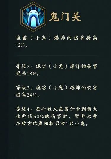 鬼门关是中国神话传说中阴曹地府的一个关隘,也是阴世、阳间之交界外,死亡的边缘。酆都大帝使用该天相效果,会触发被动-魑魅诡雷的能力。在战斗时,诡雷(小鬼)爆炸的伤害提高一定概率。