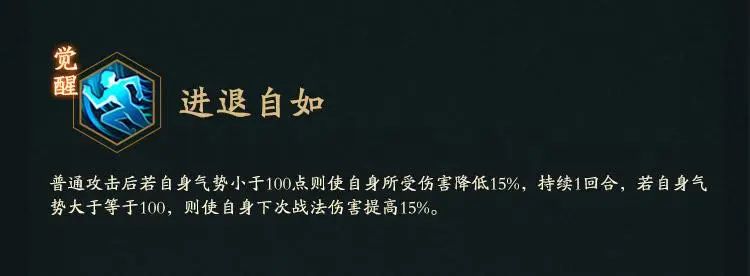 酆都大帝处理鬼魂时总是游刃有余,能退能进。此觉醒激发,普通攻击后若自身气势小于100点则使自身所受伤害降低一定概率,持续1回合,若自身气势大于等于100,则使自身下次战法伤害提高一定概率。