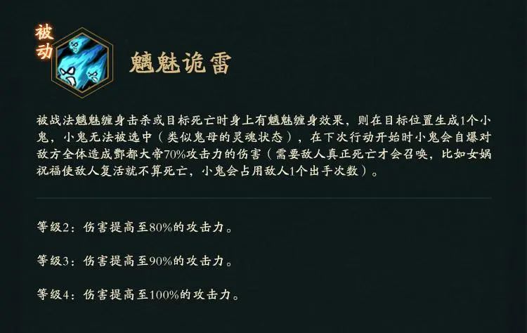 酆都大帝不但会摄取魂魄,还会将魂魄转化为攻击力量!此被动是被战法-魑魅缠身击杀或目标死亡时身上有魑魅缠身效果,则在目标位置生成1个小鬼,小鬼无法被选中(类似鬼母的灵魂状态),在下次行动开始时小鬼会自爆对敌方全体造成酆都大帝70%攻击力的伤害(需要敌人真正死亡才会召唤,比如女娲祝福使敌人复活就不算死亡,小鬼会占用敌人1个出手次数) 。