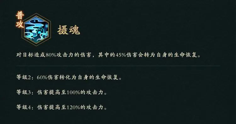酆都大帝善于和鬼魂沟通,并使用法术对鬼魂进行摄取。因此他的普攻是利用法术摄魂进行攻击伤害。当酆都大帝攻击敌方时,对目标会造成一定概率的攻击力伤害,其中的一部分伤害会转为自身的生命恢复。