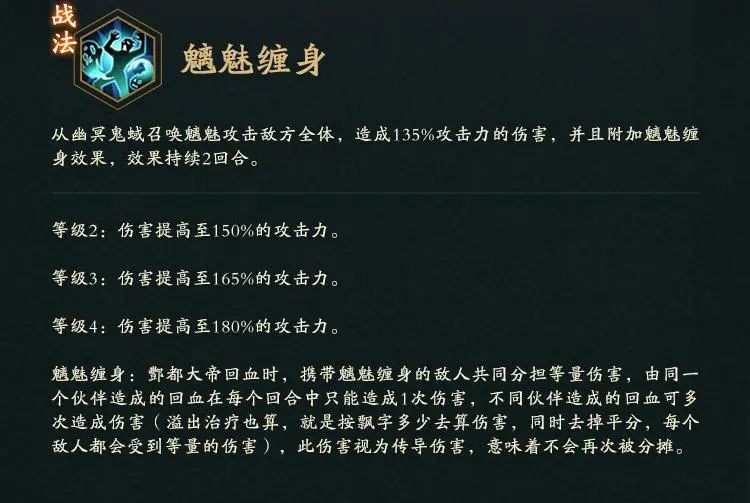 魑魅魍魉,莫能逢之,酆都大帝有着管控鬼魂的能力,因此战法-魑魅缠身就是以这种能力为原型发挥的。在战斗时,酆都大帝会从幽冥鬼蜮召唤魑魅攻击敌方全体,造成攻击力的伤害,并且附加魑魅缠身效果,效果持续2回合。