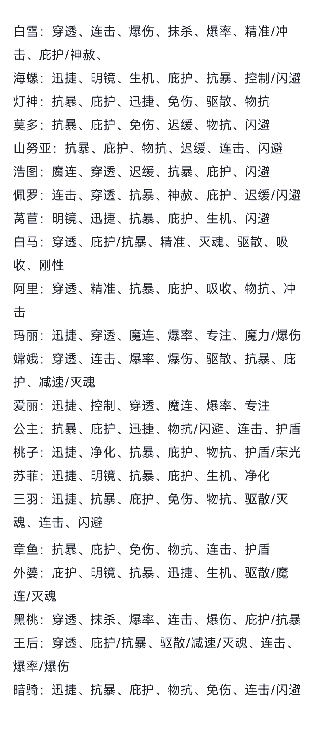 王后,玛丽,温蒂,嫦娥,黑桃,都和白雪有适当的配合,前期没什么英雄可以选择搭配进去,后期全肉的情况也可自行替换。