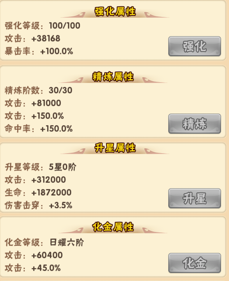 ②神兵培养:神兵培养洗炼最高可以有31.7%攻击加成,金书炼技运气好也可以有40%攻击加成