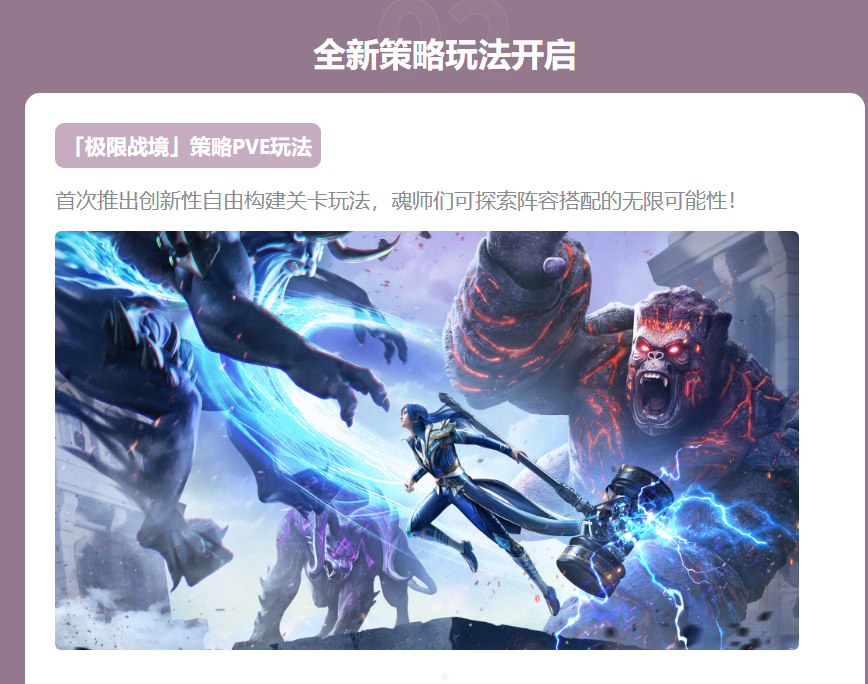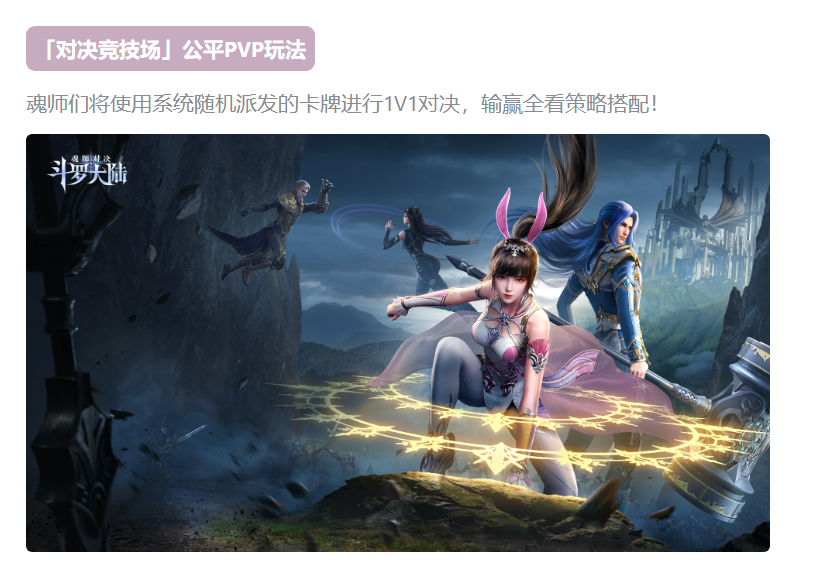 然后是一个PVP类型的新玩法“对决竞技场”,从介绍中我们可以看到这个玩法讲求的是使用系统随机派发的魂师卡牌来进行1V1对决,其中不知道出了基础的魂师卡牌之外还会不会新增一些类似于策略性的新卡牌机制,如果有的话应该还算值得期待。