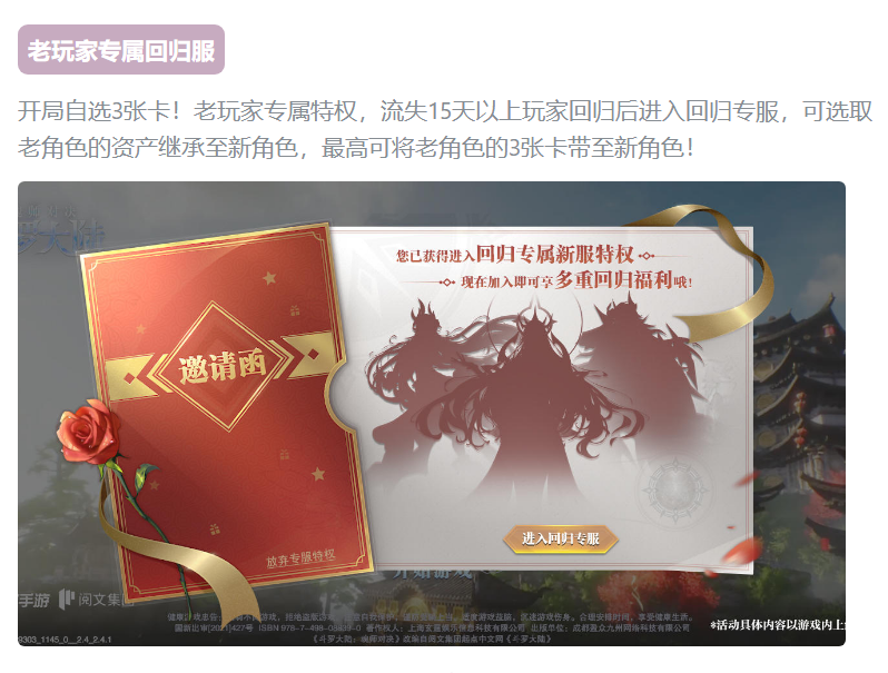 最后之前疯传的回归服可以自选3张魂师的问题,从上图中的介绍看起来应该是可以从老账号已经拥有的3名魂师带到回归服中,当然暂时也不太清楚能不能在回归服里面自选未拥有的魂师,这点还需要官方后续做准确的解释。