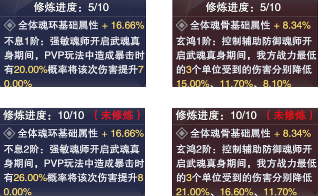上图分别是修魂(左侧)与炼体(右侧)在第5级和第10级时的技能效果,其中我们需要注意的是:修魂主要针对的是PVP中我方强攻系和敏攻系魂师开启武魂真身后的暴击增伤效果,而炼体则主要针对的是任意战斗中,我方控制系和防辅系魂师开启武魂真身后的减伤效果,而目前受制于上下的武魂真身总数量只有6个,因此官方也暂时只更新了以上4个技能的效果,日后玄元决的第二重效果还暂未可知,所以我们能够提供给大家的建议都是建立在第一重效果之上的。