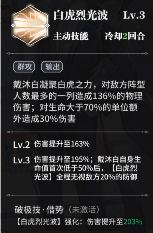 一技能:白虎烈光波,对敌方造成一排造成伤害,戴沐白生命值首次低于50%无视20%防御
