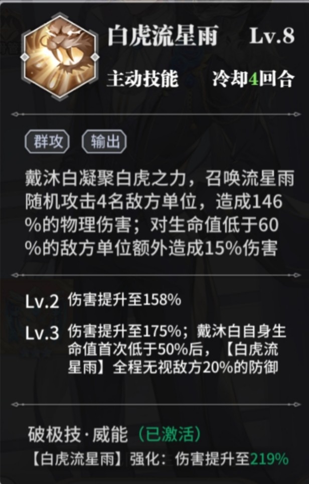 二技能:白虎流星雨,对敌方随机4名敌人造成伤害。戴沐白首次生命低于50%无视20%防御