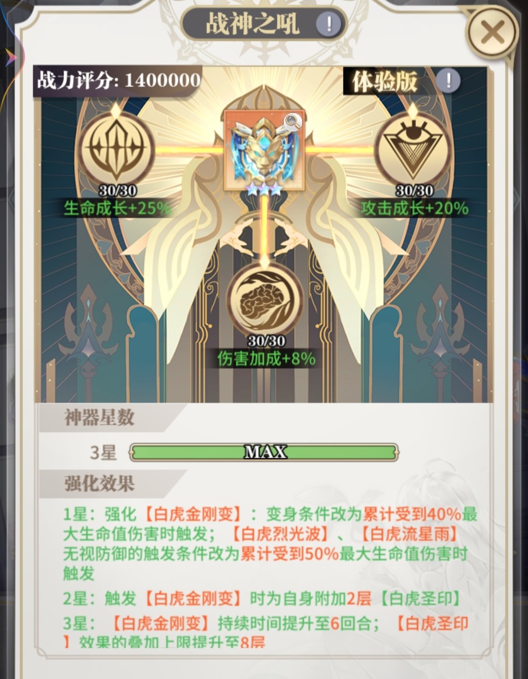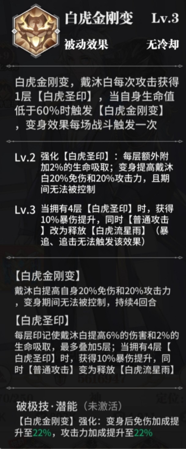 四技能:白虎金刚变,提高20%免伤和20%攻击,变身期间不受控。每次攻击获得一层印记,每层印记提高2%吸血和6%伤害加成,4层印记后提高10爆伤及普攻变白虎流星雨。