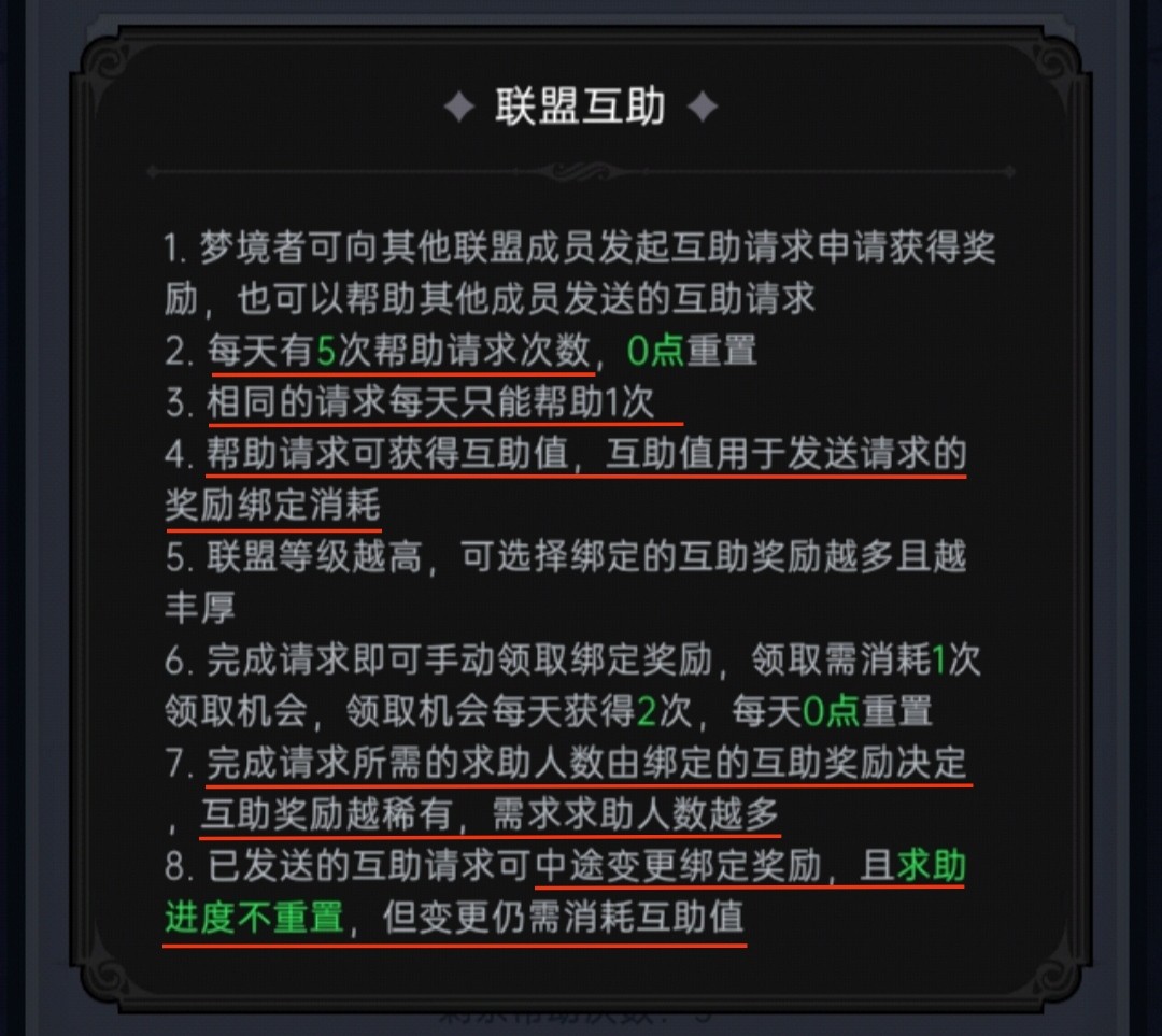 2.每个联盟成员一天只可帮助他人5次,一个互助道 具只能帮助一次,每次帮助有50互助值以及80点联盟贡献的奖励