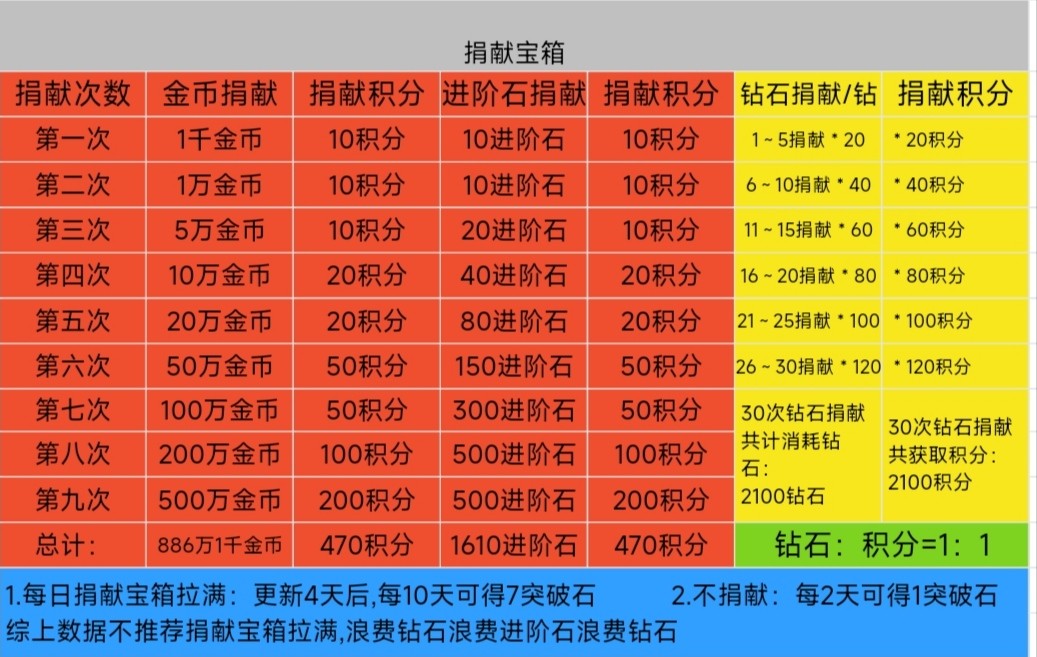 8次金币捐献+6次进阶石捐献+6次钻石捐献