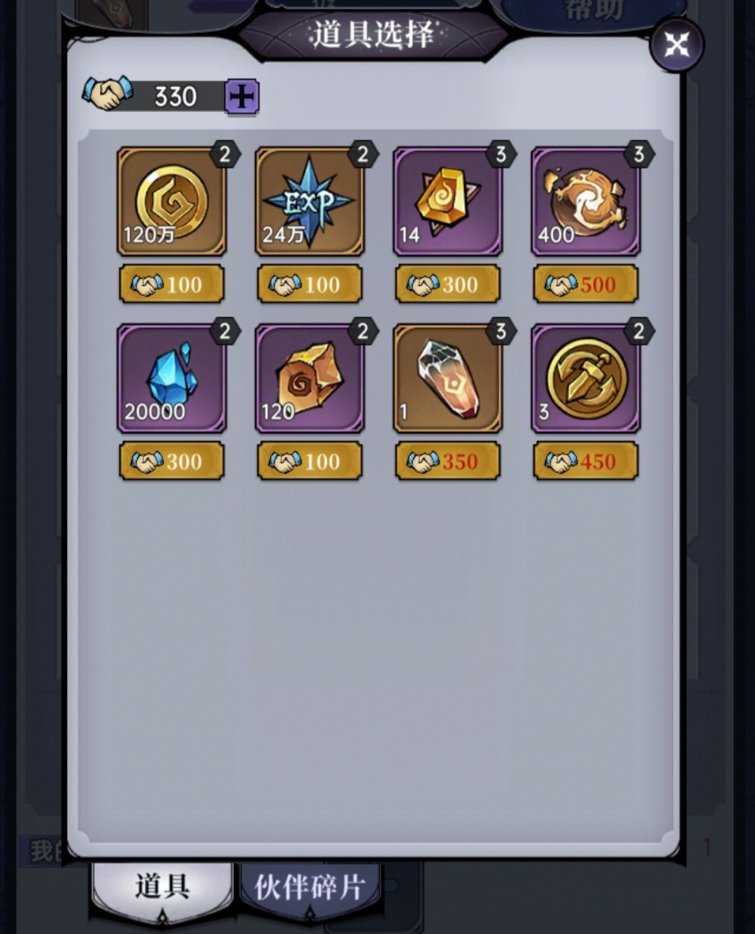 图中道具右上角的数字为该道具所需他人互助次数