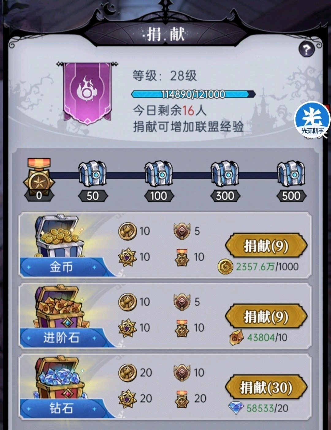 (这里注意:联盟捐献宝箱是个人进度不是联盟共 享)