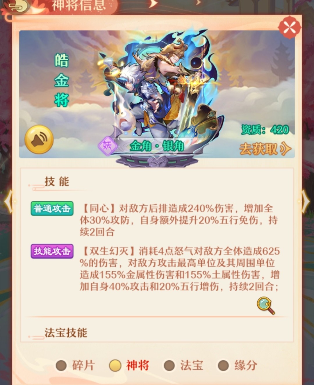 由于是双生神将的缘故,所以法宝之灵的属性也不同于其它神将: